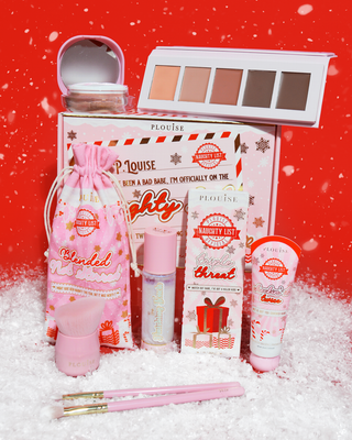 Giant Stay Shining Crown Lip Oil gift box with pink lip oils in it against a red background with snow