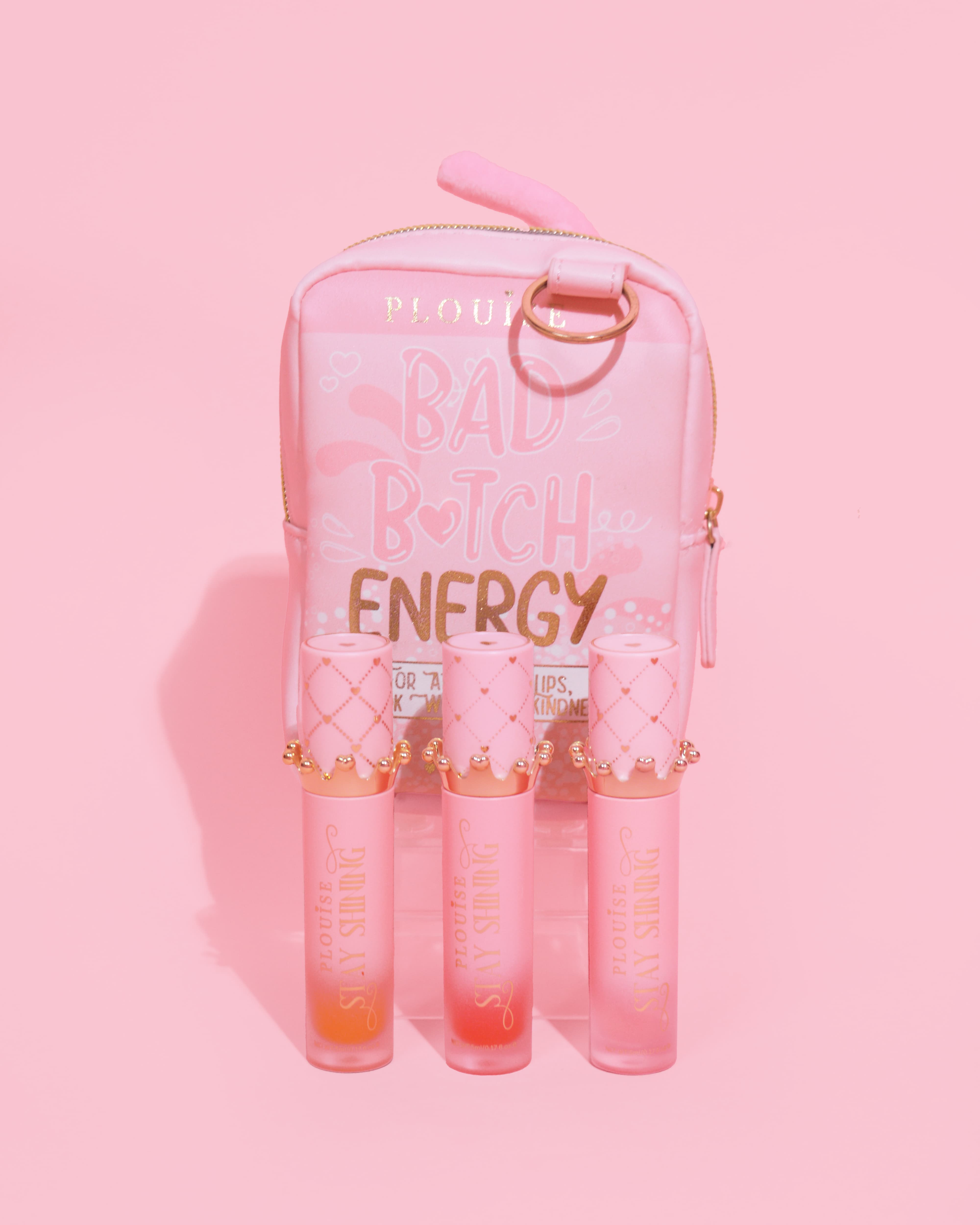 Each trio features 3 Stay Shining Lip Oils and our signature Bad Bitch Energy Bag -  because being that girl means staying glam on the go.